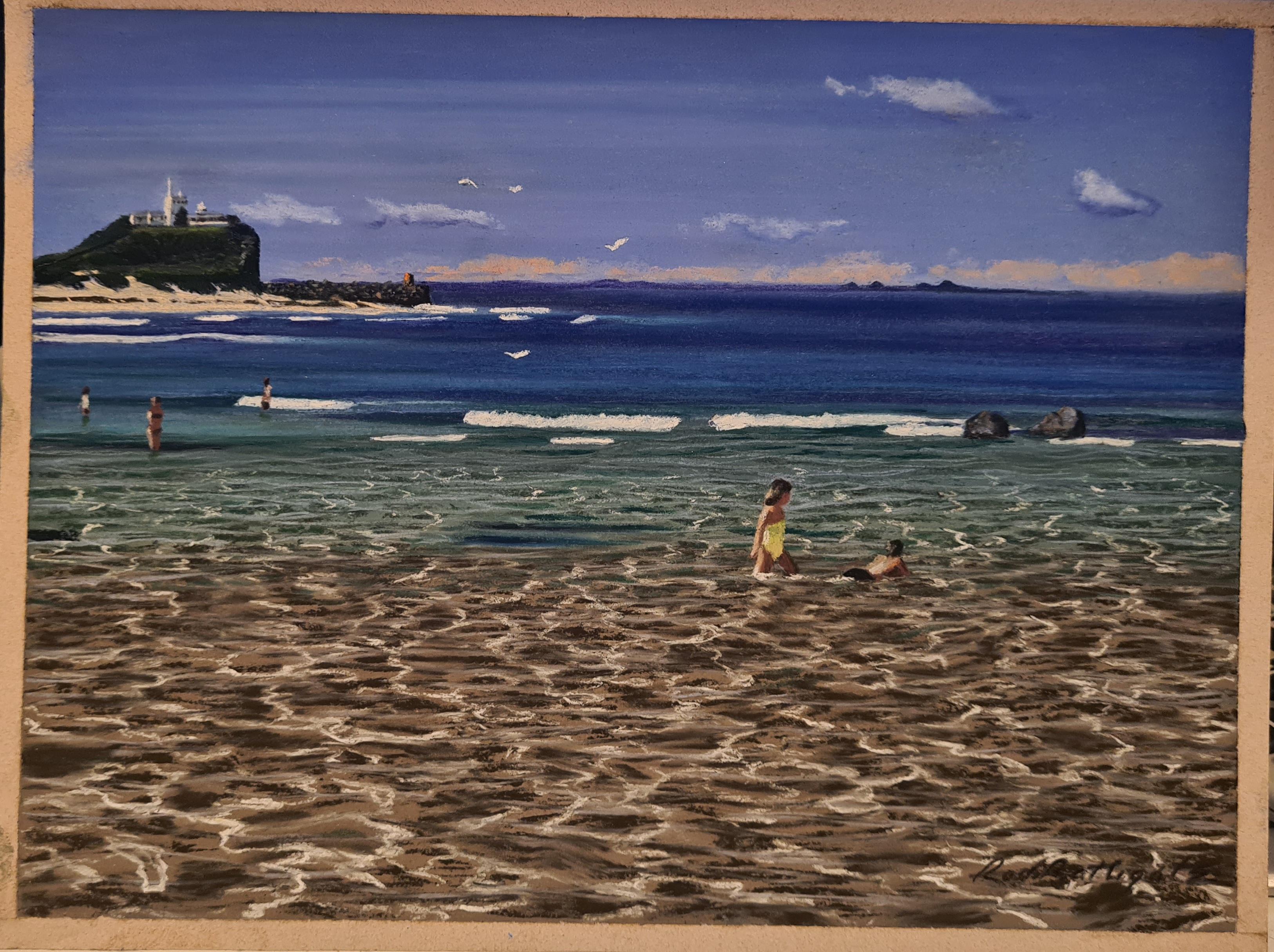 Rod is not only accomplished with pastel on paper and board, but equally so in oil painting. Photolike complicated compositions detailing, light, water effects and beachscapes with a figurative aspect are what we expect from this artist.