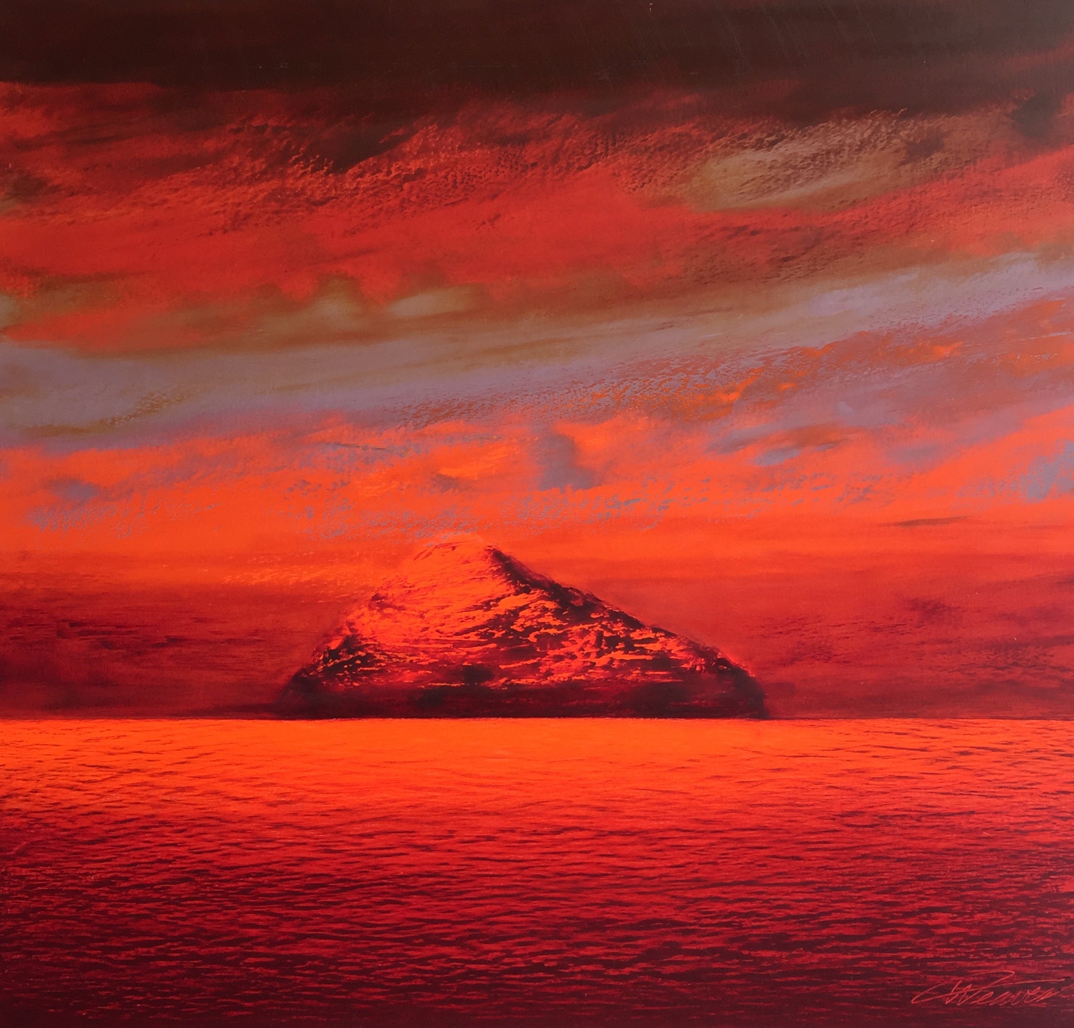 Artists Comment: The island is the focal point standing as symbol of isolation, resilience and transformation. Predominately a red painting with subtle variations of greys and browns.