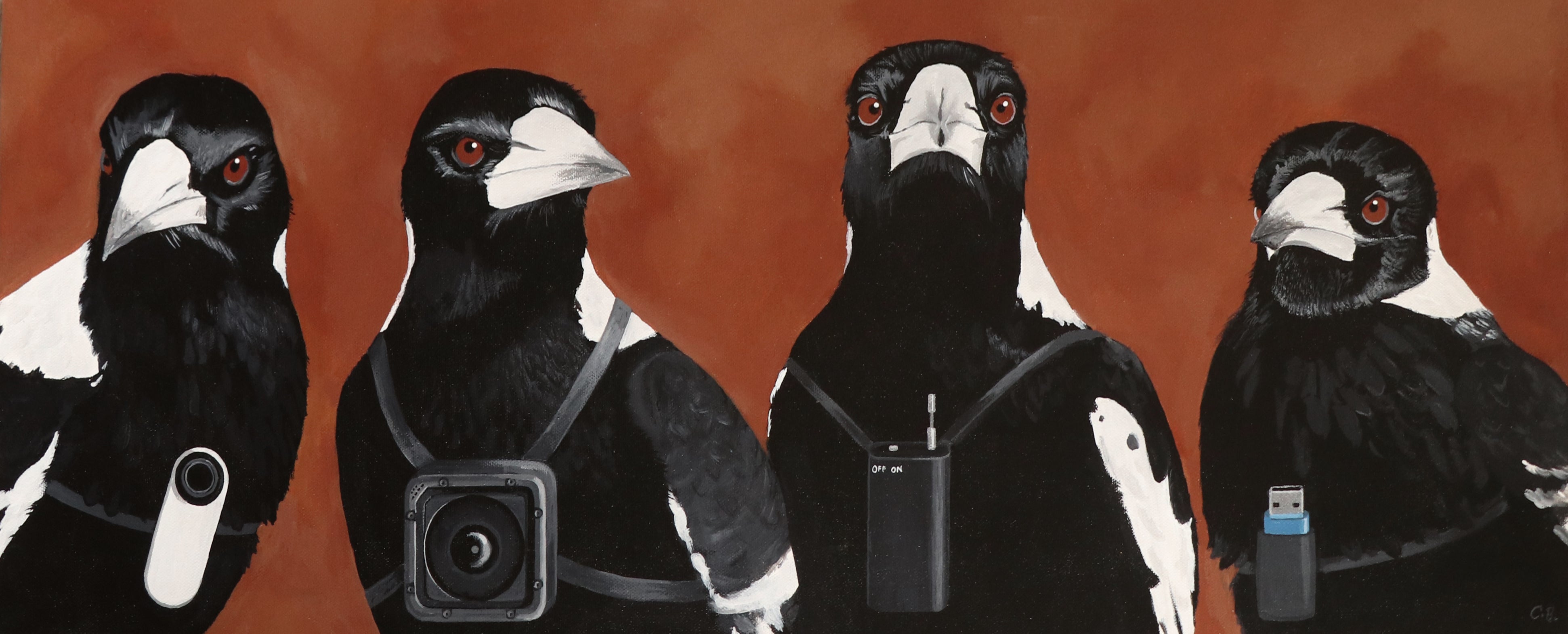 Artist Statement: Magpies manage to look both friendly and sinister at the same time. This quartet are the modern successors to WWII spy pigeons.