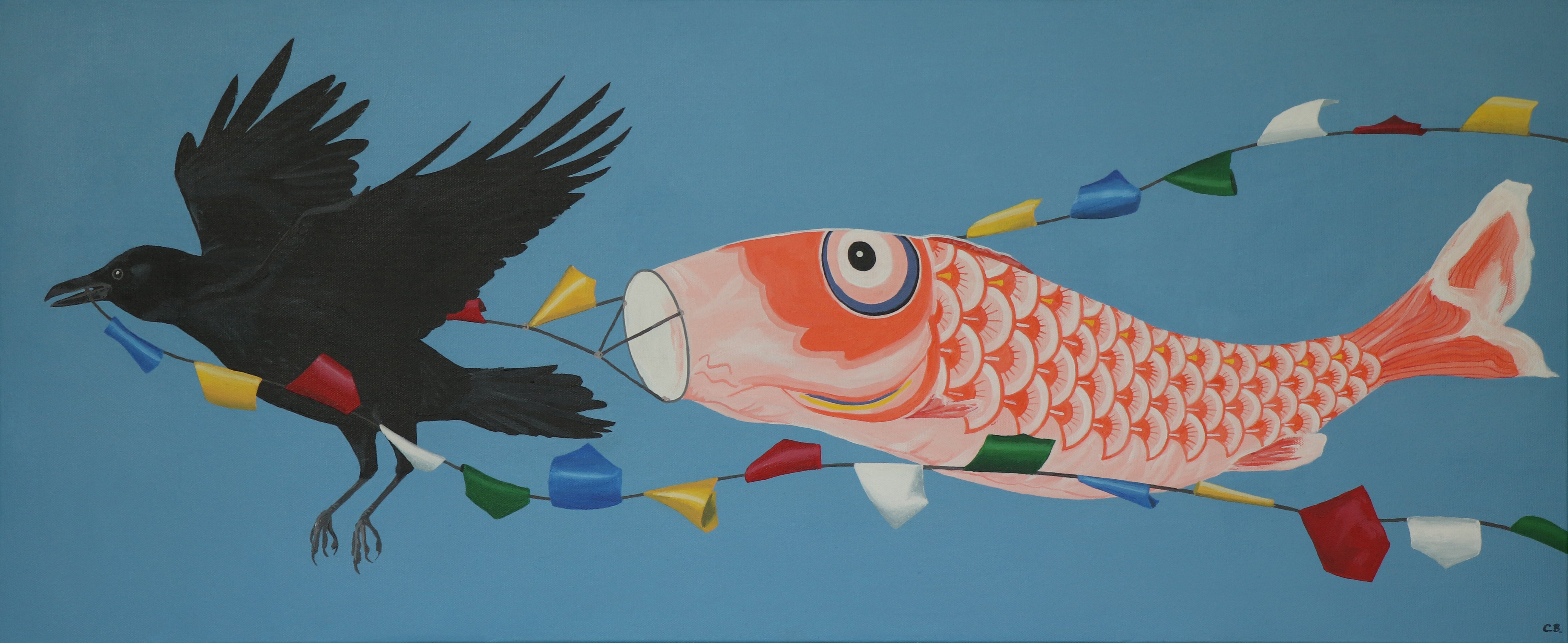 Artist Statement: Sitting outside for lunch attracts the attention of great glossy crows. They're intimidating enough to make me consider handing over my food, and daring enough to take anything they like. The one in this painting fancies fish.