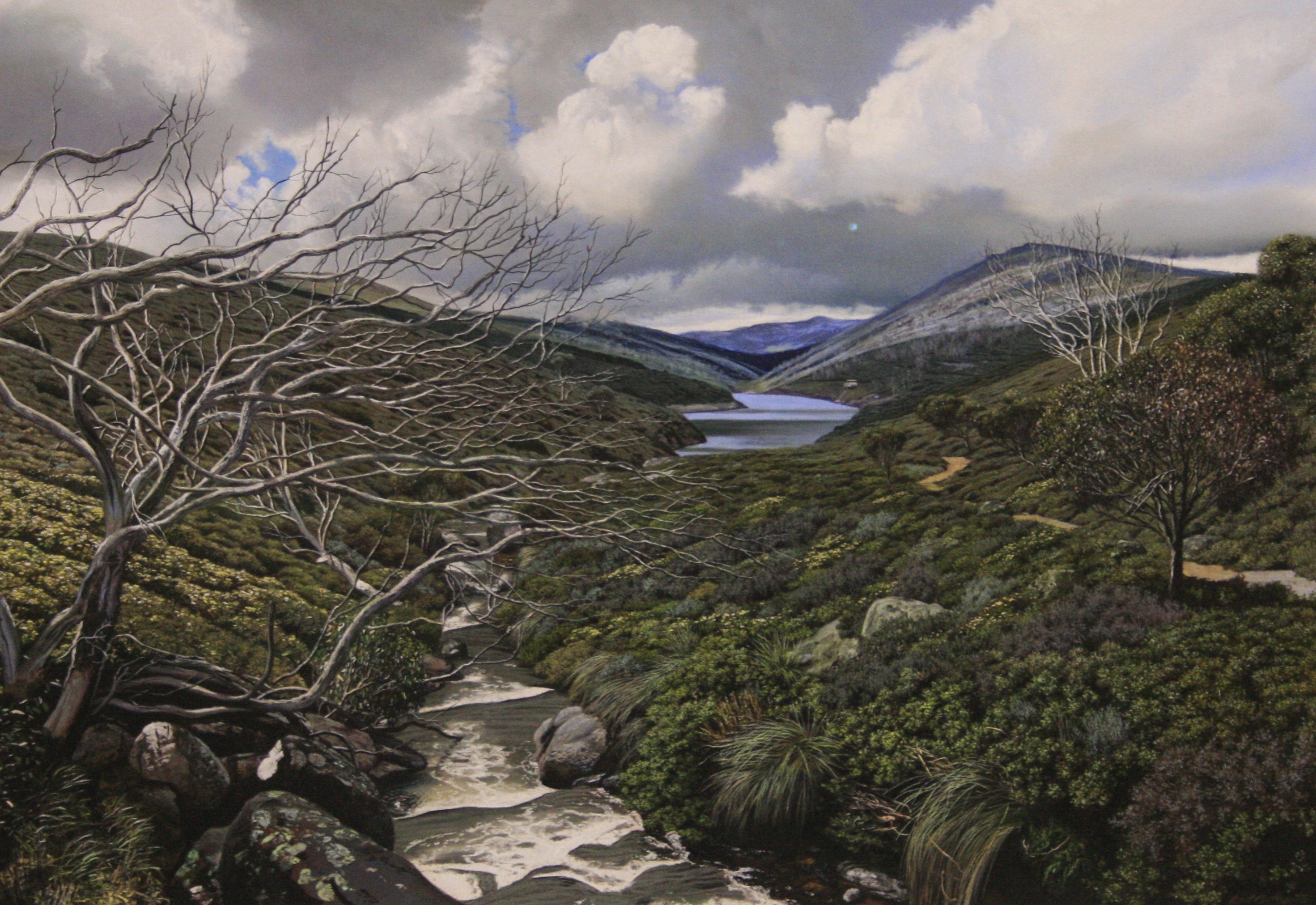 Artist Statement: An icy stream flows through the heath covered high country windswept lake. A storm tears across the distant hills.