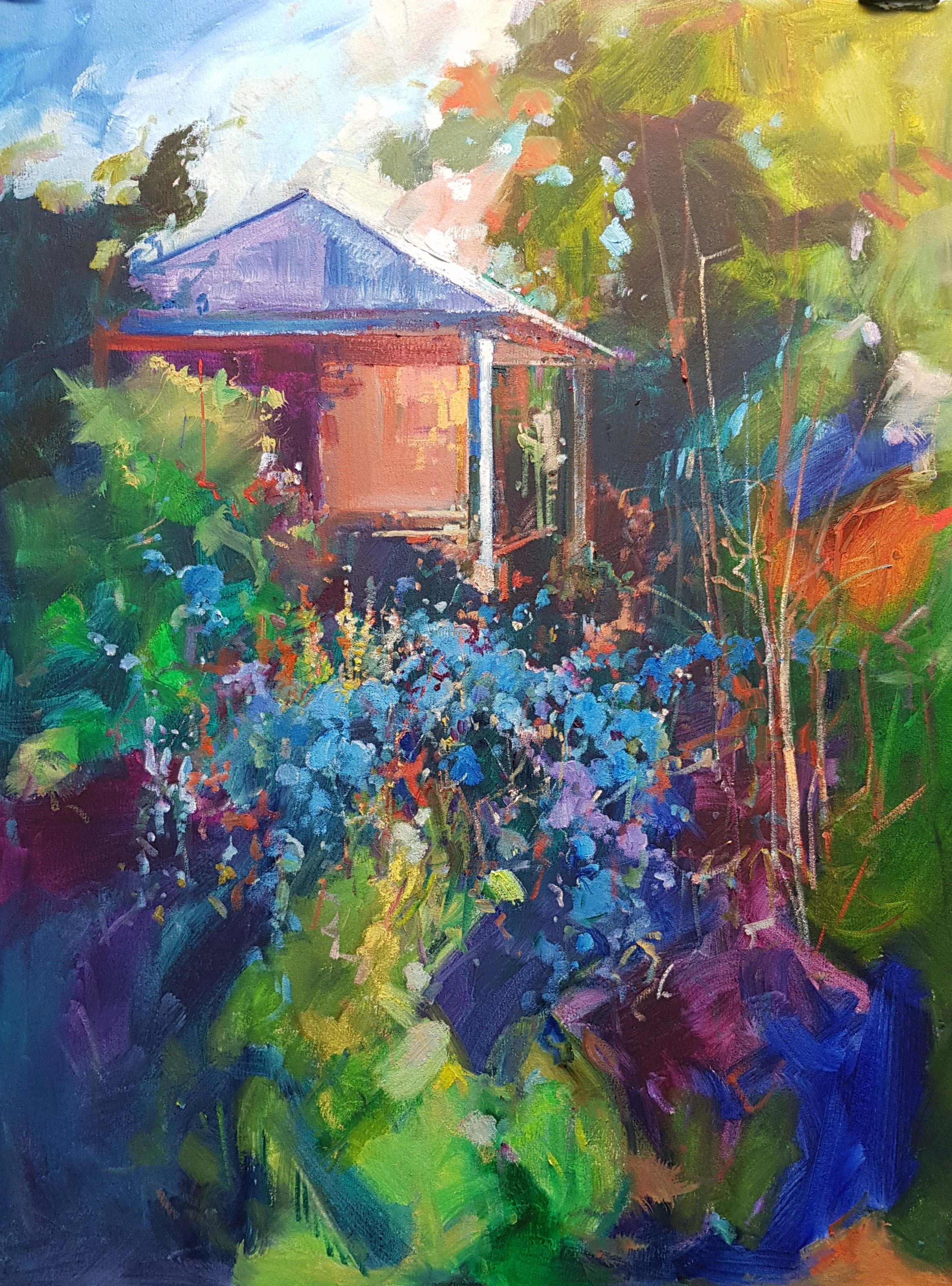 door of my studio, hydrangeas in bloom and a number of other self sown shrubs and colourful intruders thriving. Free flowing paint and lots of light. - Ken Strong.