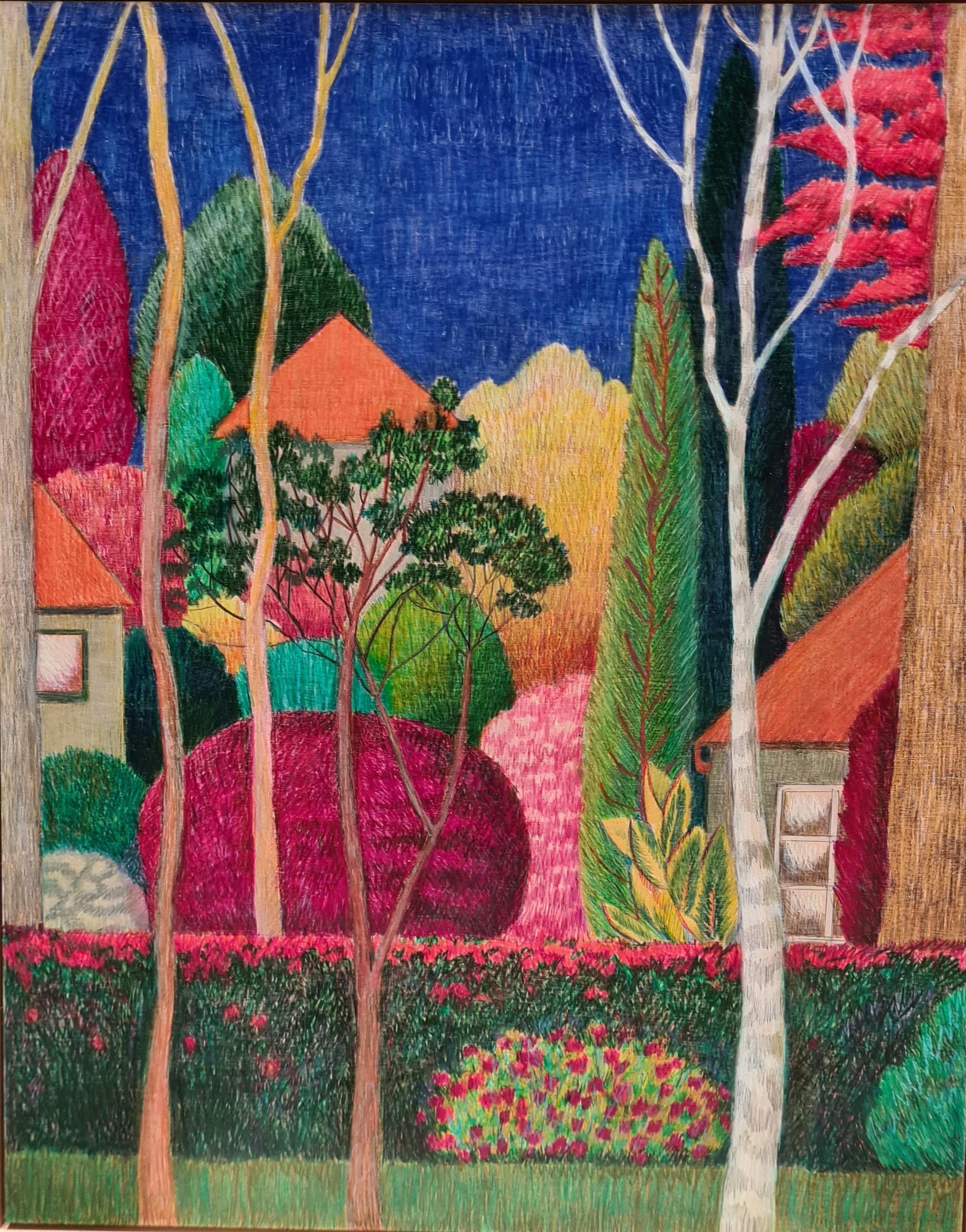 It has been a period of deep reflection and for this I am so grateful. The painting 'Silver Lining' is aptly named as it is symbolic of the great side of being in solitude - a mass production of work that otherwise would not have come to be. I breathe in the fragrant air up here and that alone is inspiration but on top of that there are endless vast and luxurious gardens full of colour and form to wander through. I feel this was meant to be a sign to pause from my other life of Argentine tango and socialising and concentrate fully on my art. I start with a vision in my mind’s eye then do rough sketches but never anything concrete as I love to 'doodle' and allow the painting to develop by itself. I feel like a medium just recording this event. I generally work with memories of childhood, mixed with the contrast of geometric shapes of man-made objects and houses and the soft forms of trees and shrubs. I paint from dark to light adding texture with thin glazes, and work in oils on canvas, pencil on wood or linocut printmaking. My huge garden has been a refuge in these troubling times and I have been doing more close-up work of the flowers I find, they are so intricate and delightful and never cease to amaze me. I absorb the essence of life and recreate and interpret this in my studio, creating a sort of utopia in which to ramble".