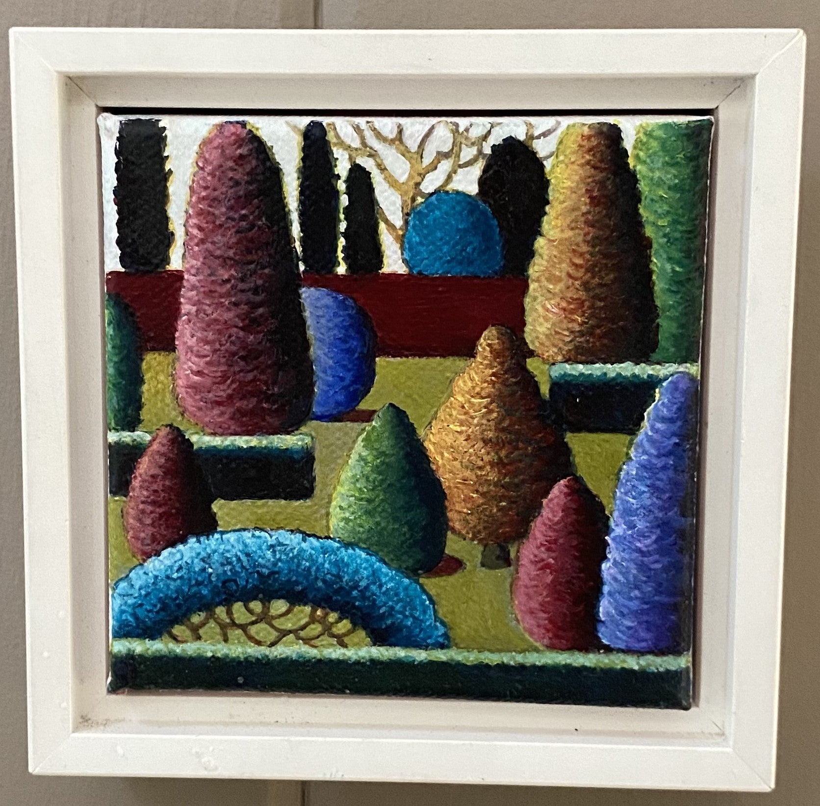 It has been a period of deep reflection and for this I am so grateful. The painting 'Silver Lining' is aptly named as it is symbolic of the great side of being in solitude - a mass production of work that otherwise would not have come to be. I breathe in the fragrant air up here and that alone is inspiration but on top of that there are endless vast and luxurious gardens full of colour and form to wander through. I feel this was meant to be a sign to pause from my other life of Argentine tango and socialising and concentrate fully on my art. I start with a vision in my mind’s eye then do rough sketches but never anything concrete as I love to 'doodle' and allow the painting to develop by itself. I feel like a medium just recording this event. I generally work with memories of childhood, mixed with the contrast of geometric shapes of man-made objects and houses and the soft forms of trees and shrubs. I paint from dark to light adding texture with thin glazes, and work in oils on canvas, pencil on wood or linocut printmaking. My huge garden has been a refuge in these troubling times and I have been doing more close-up work of the flowers I find, they are so intricate and delightful and never cease to amaze me. I absorb the essence of life and recreate and interpret this in my studio, creating a sort of utopia in which to ramble".