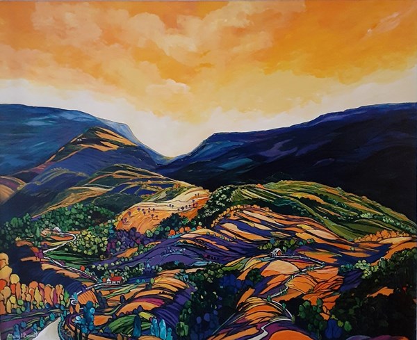 Exhibition Statement: Hills and valleys kissed by the golden hue of the sun. A landscape as seen through my eyes evolve from within.- Cheryl
