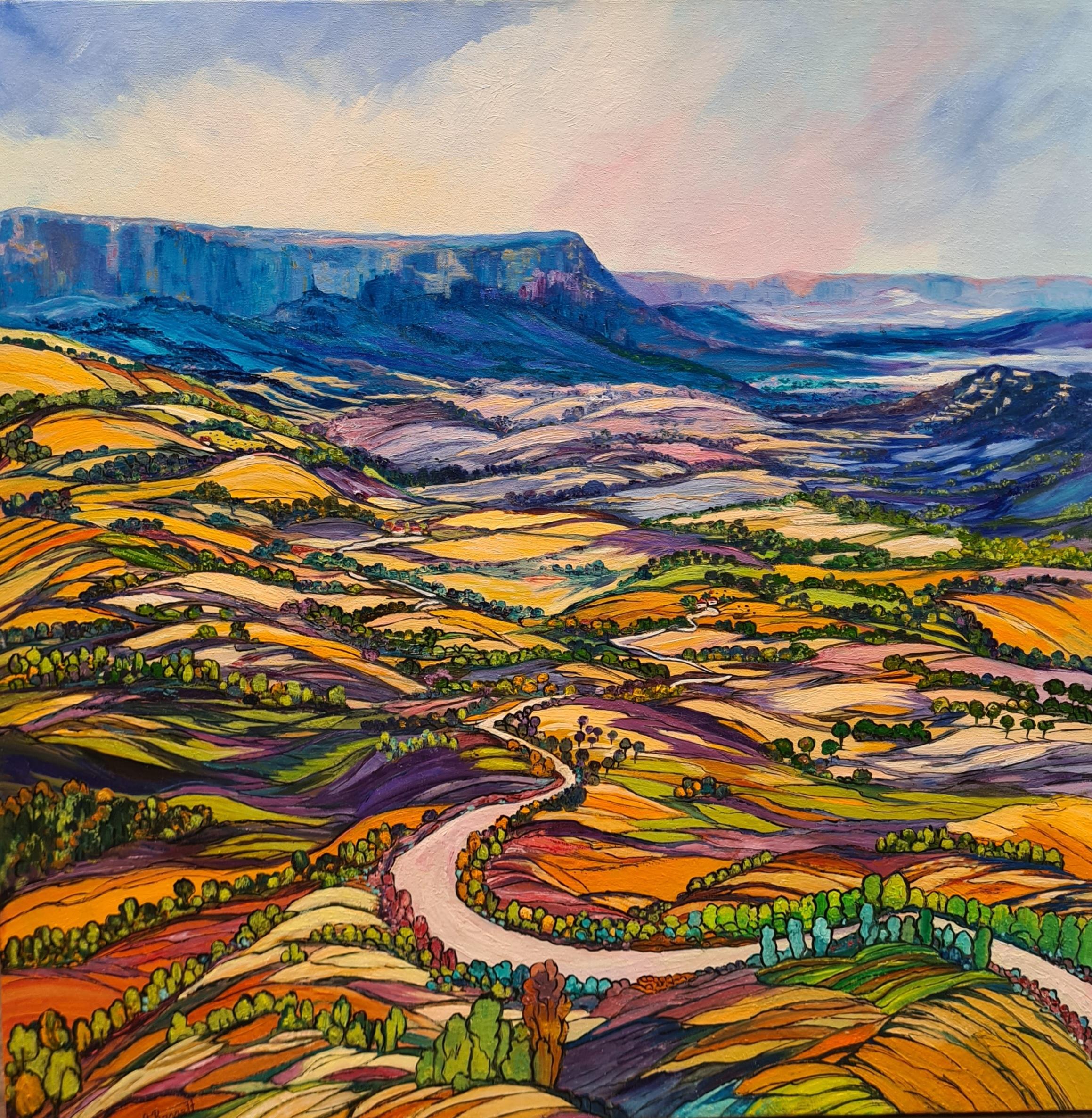 Exhibition Statement: This artwork describes my colourful self imaginative vision of our beautiful Hunter Valley. The deep shadows of the valleys, sunlit hills and winding roads, excites me to put paint to canvas. I love the colours that come to the completion of this artwork, almost a mosaic representation - Cheryl