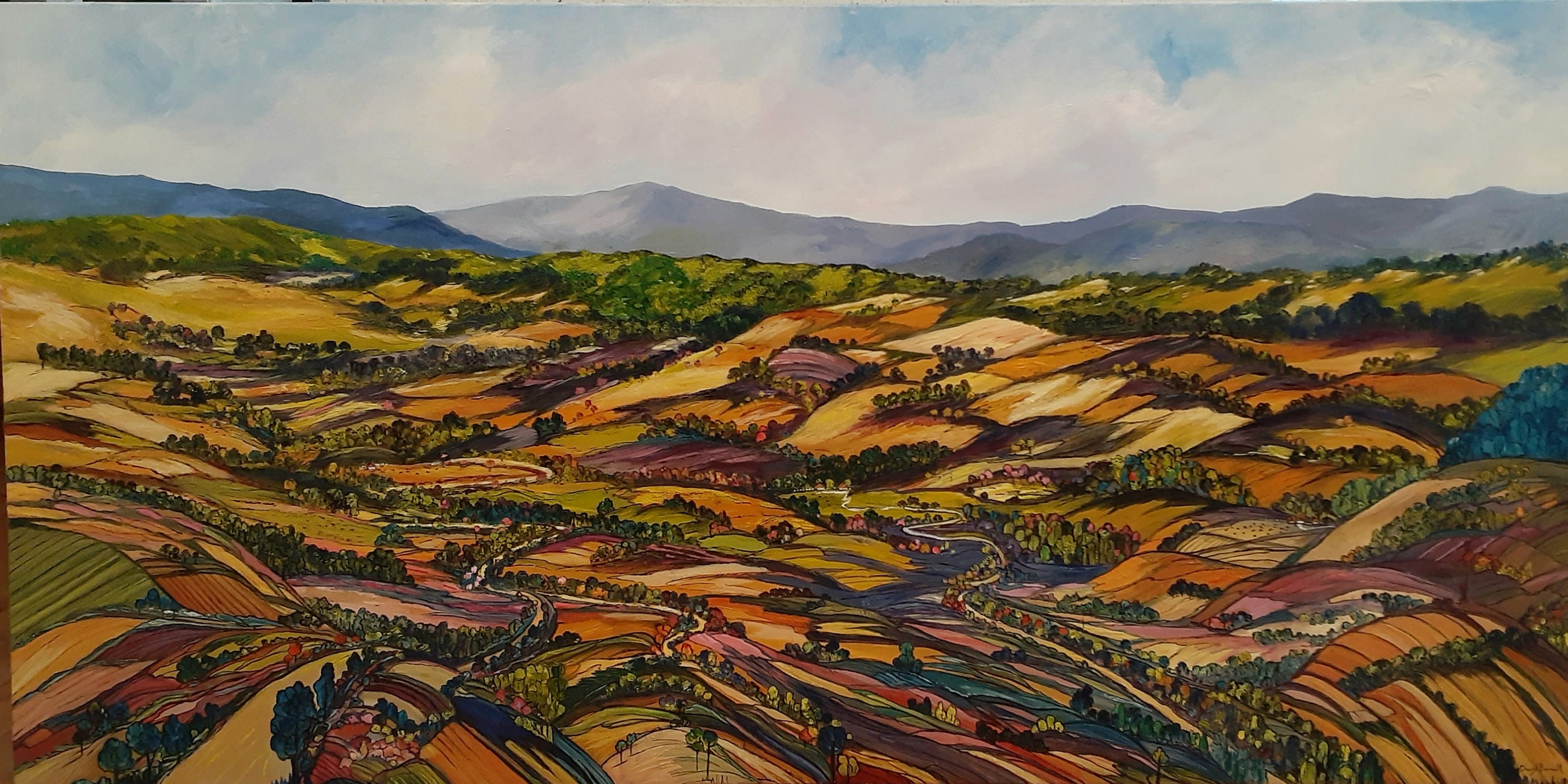 Exhibition Statement: This artwork represents how the sun reflects on the hills in our beautiful Hunter Valley, as I see it through my eyes, my representation of the landscape.- Cheryl