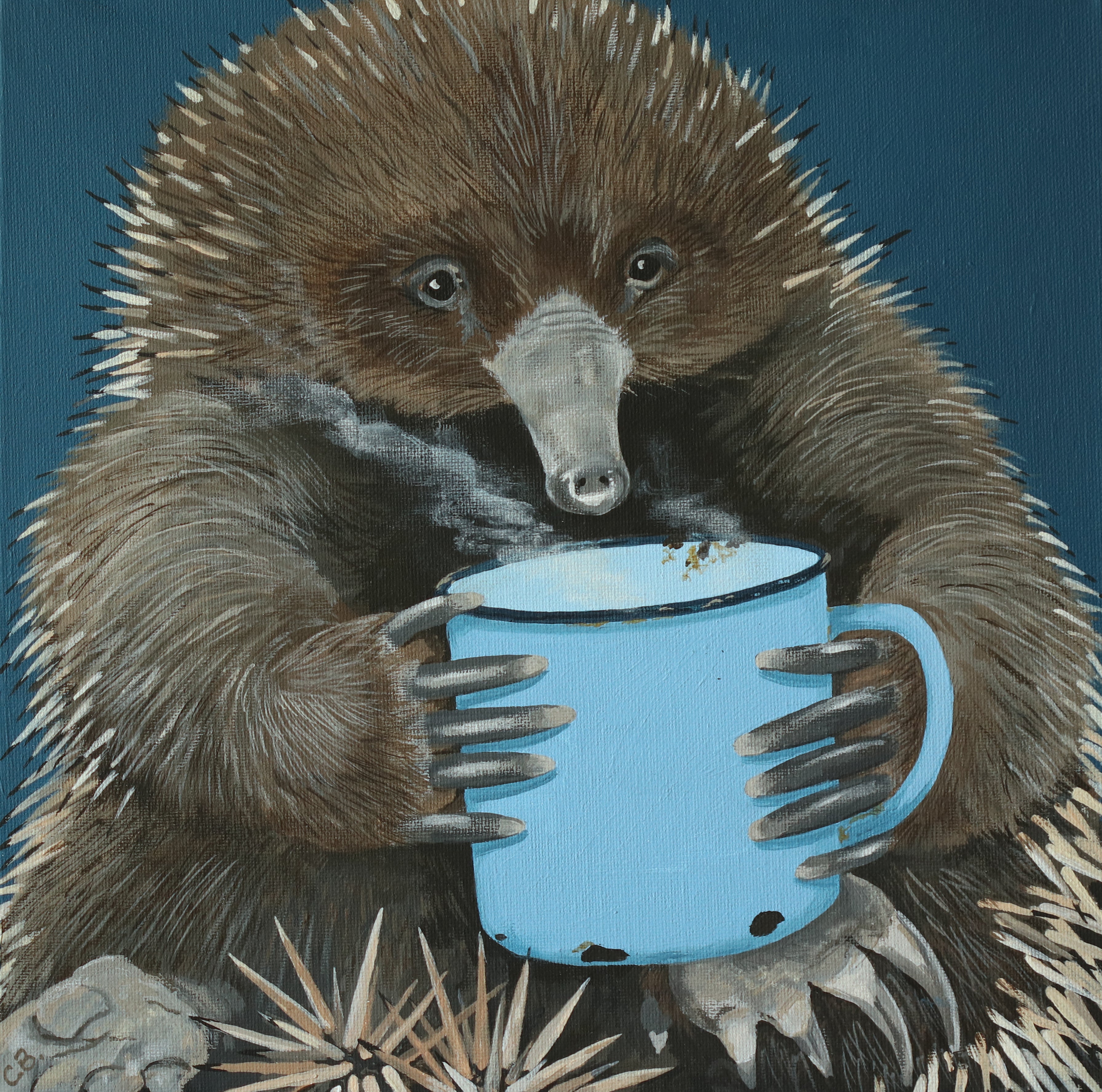 Artist Statement: Late one afternoon, I came across a rather lost echidna wandering a hospital carpark. Lacking any means of safely transporting it, I left it to find its own way, but it might have need ed a strong cup of tea by the time it got home.