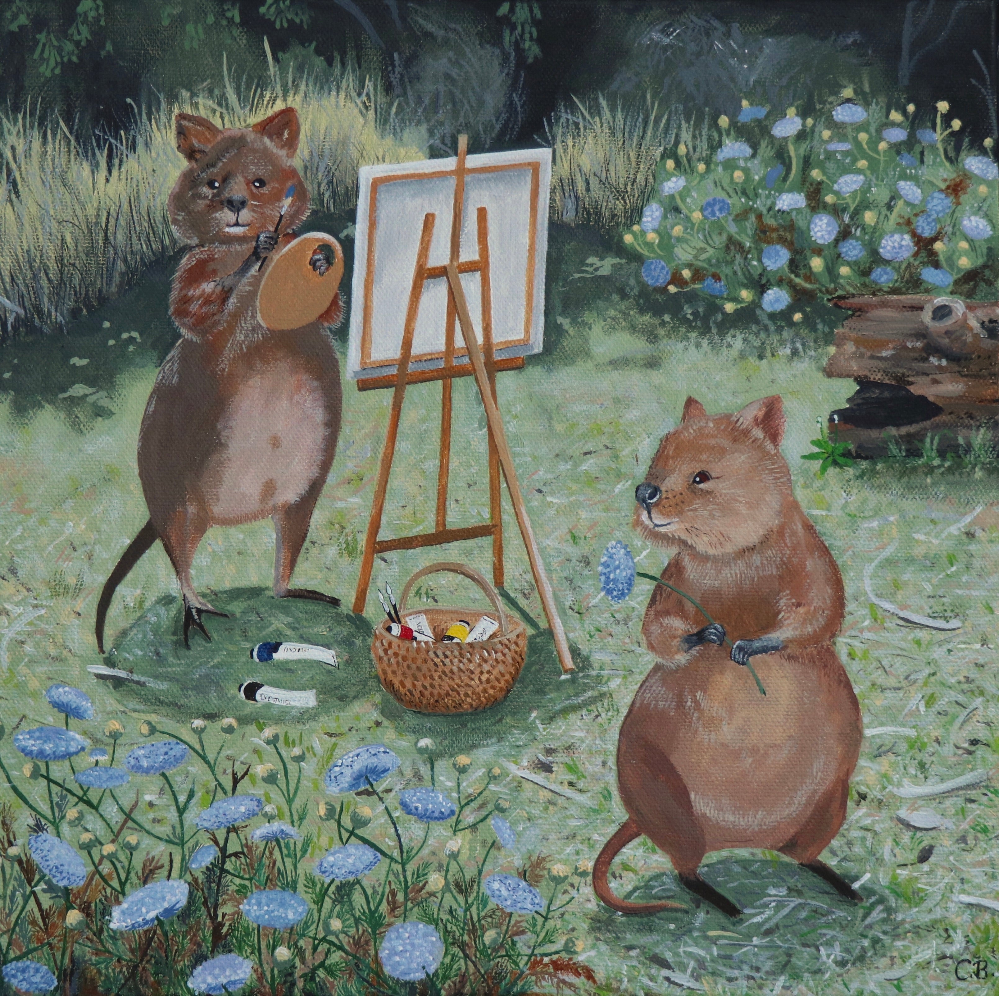 Artist Statement: Rottnest Island, WA, has some unique flora and fauna. Featured in this work are the loveable quokka and the stunning Rottnest Island Daisy.- Catherine Banney