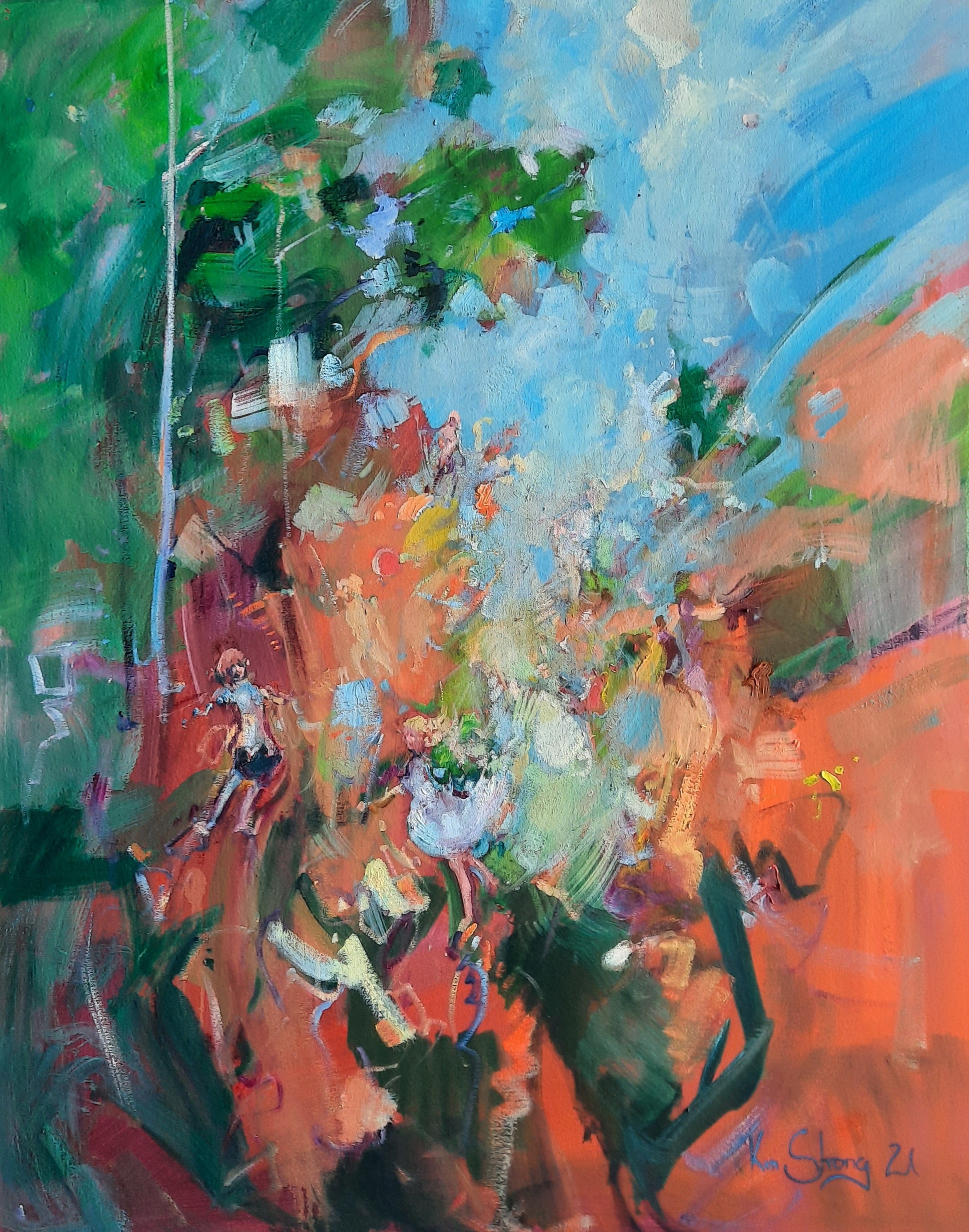 Artist Statement: A largely abstract work where the joyous mood of the children is embellished by colour and movement of their surrounds. “Their movements in time with the way that they feel”- Ken Strong.