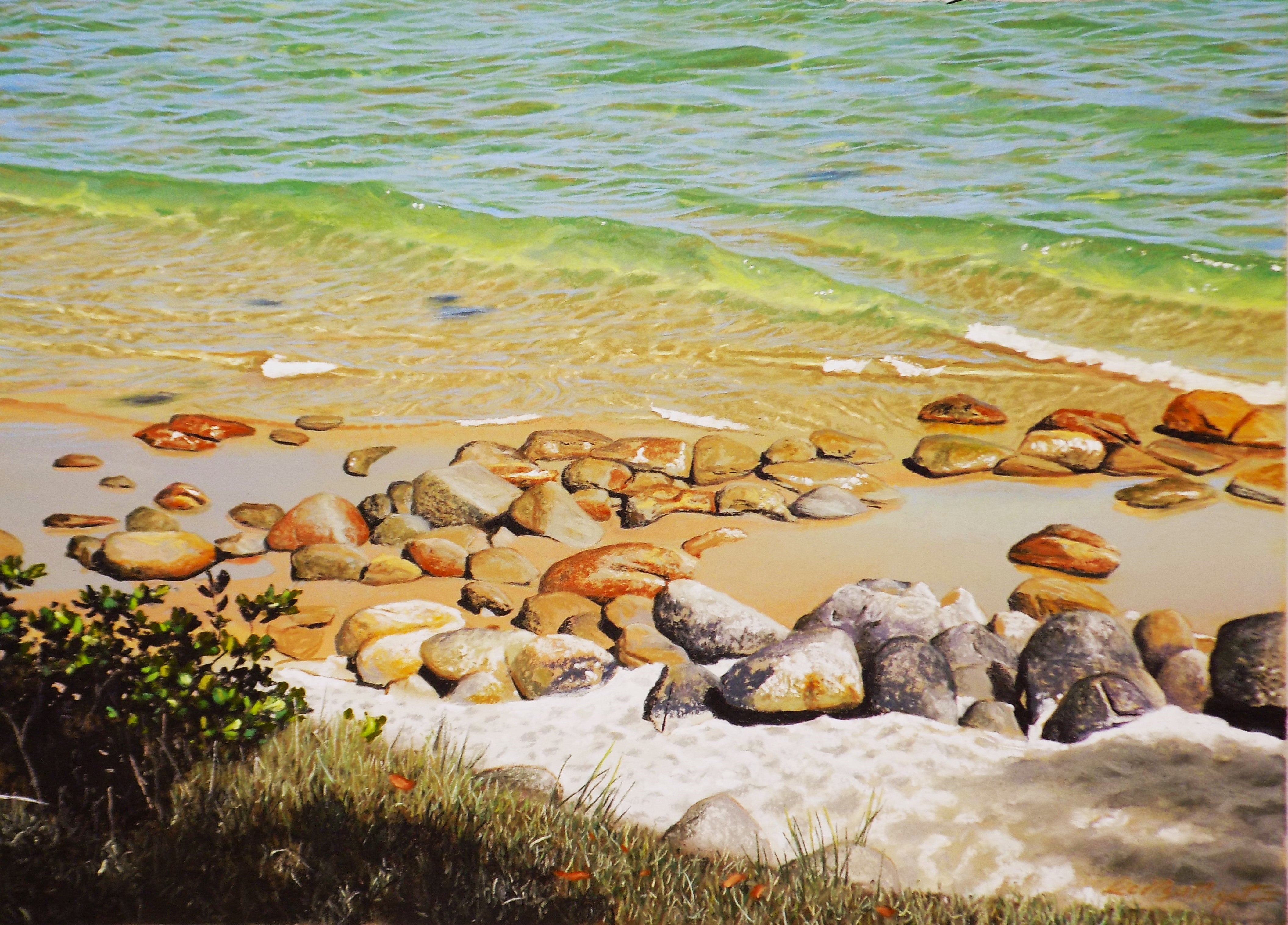Rod is not only accomplished with pastel on paper and board, but equally so in oil painting. Photo like complicated compositions detailing, light, water effects and beachscapes with a figurative aspect are what we expect from this artist.