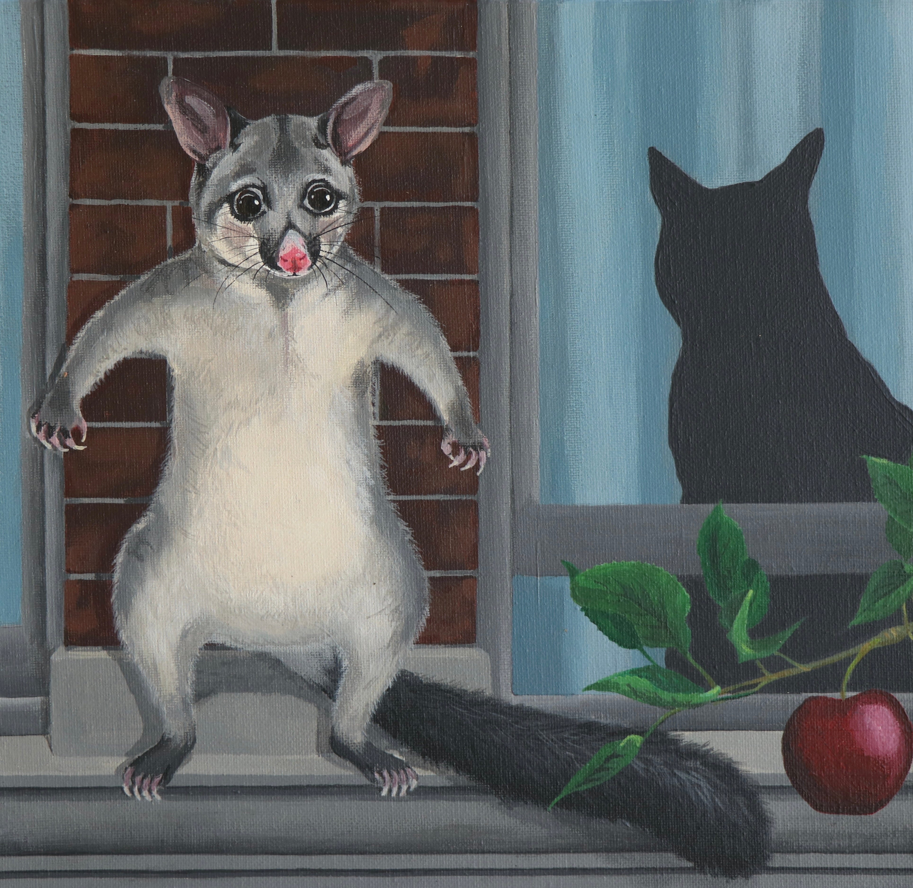 Artist Statement: Suburban homeowners have a love-hate relationship with possums. This marauding Brush-tail is engaged in a stand-off with its feline nemesis.