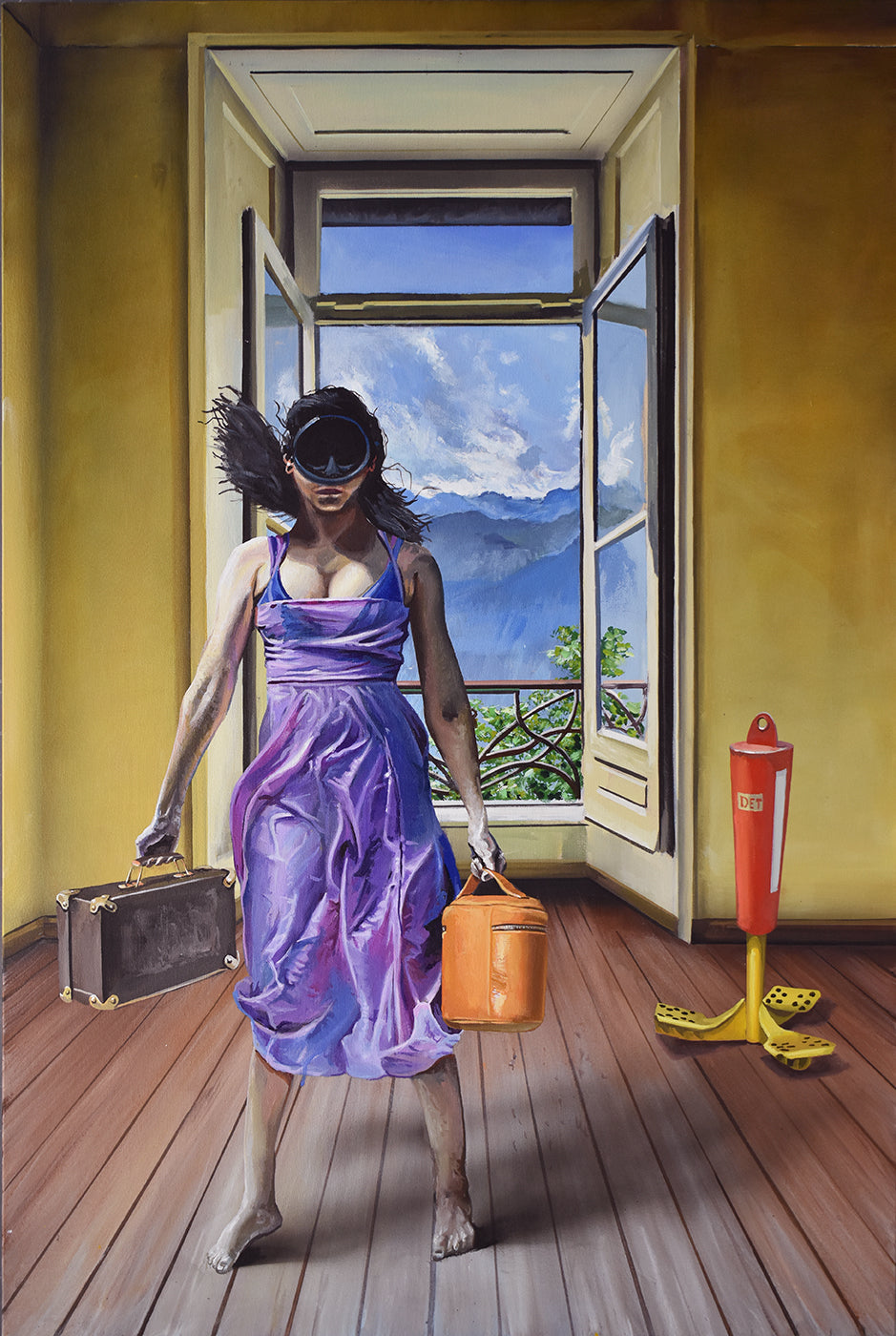 Artist statement: A woman standing socking wet looks out at us. She’s wearing a mask and is only just staying grounded. An observation on the difficulties some face everyday and the masks we wear to “stay grounded”