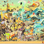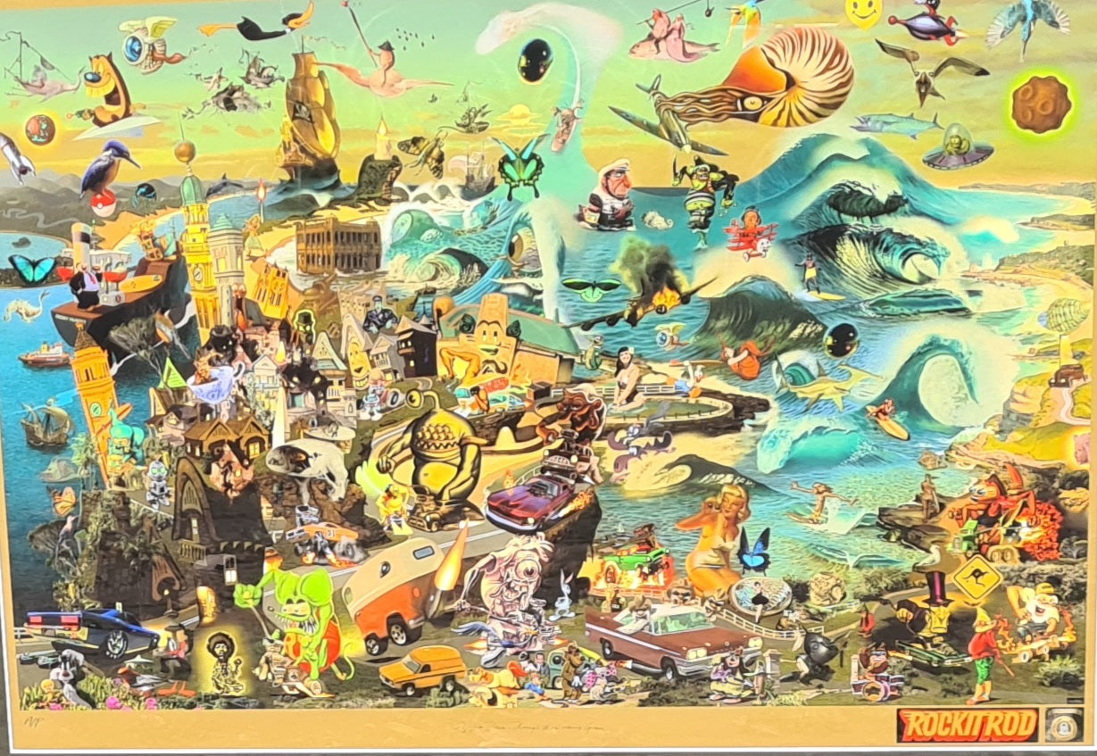 Artist Statement: Giclee print on heavy archival paper. A 2021 twilight adaption of the 2015 "Toppa Town' painting with multiple compositional changes, new characters in an evening scene with Newcastle coastline and city buildings. - Rod Bathgate