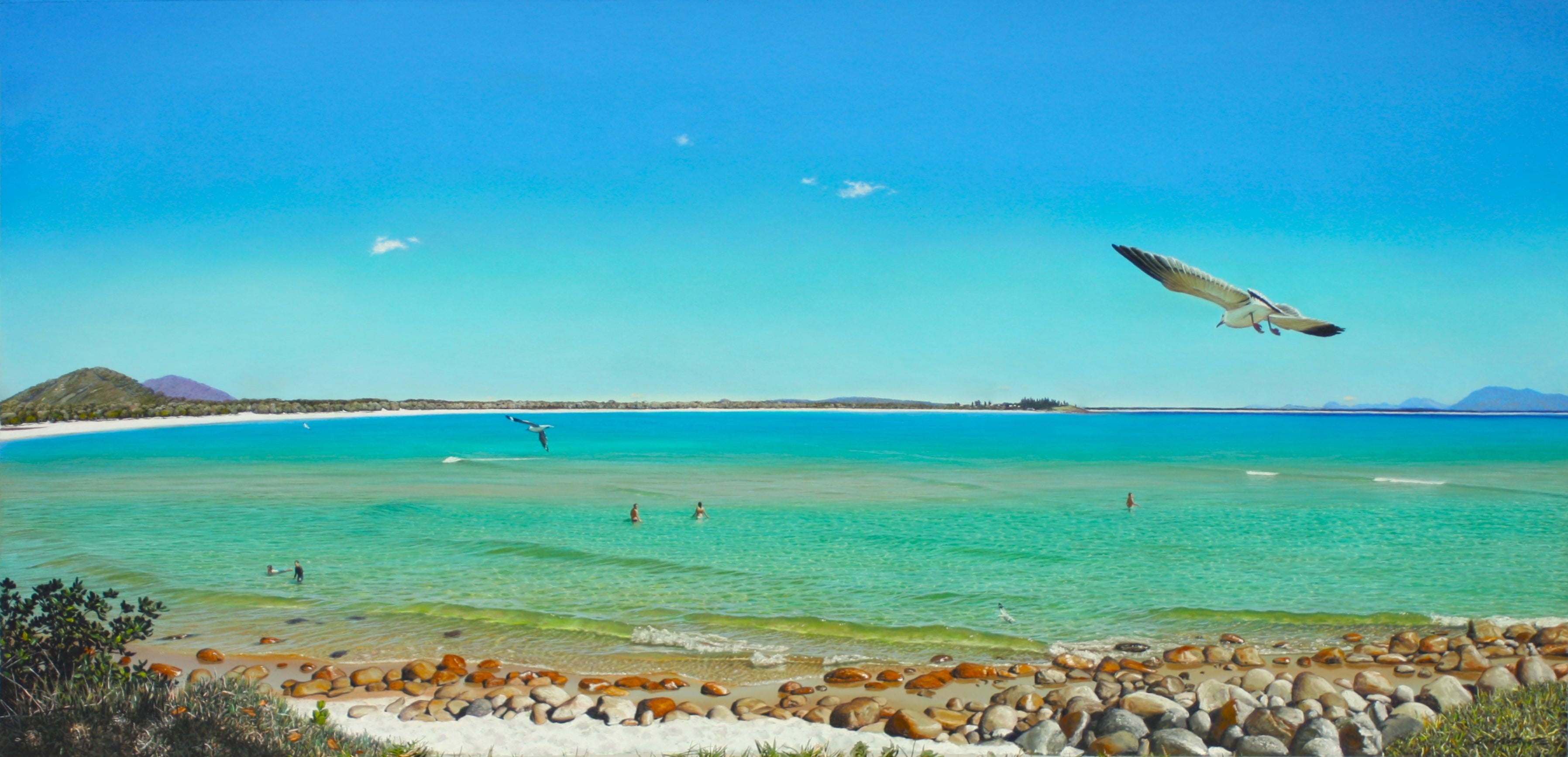 Artist Statement: Swimmers enjoy the warm waters of Trail Bay as the gulls circle over head; Smokey Cap to the left and Parrahapinni Mountain to the right, frame the expanse of the bay with South West Rocks punctuating the long thin band of white sand beach. - Rod