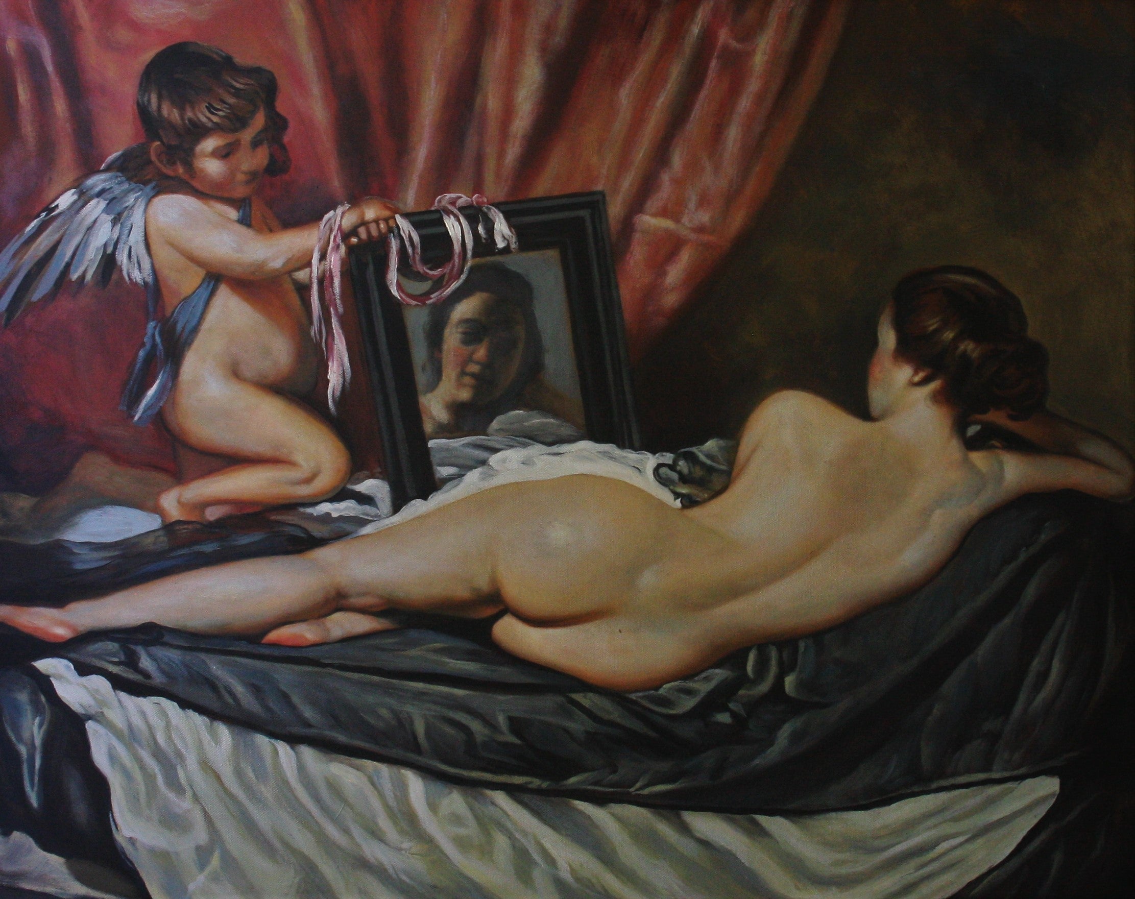Artist Statement: This was an exercise I did as a copy of Velazquez's 'Venus in her bath' in the tradition of learning the old masters technique. It is framed in heavy black - Rod Bathgate