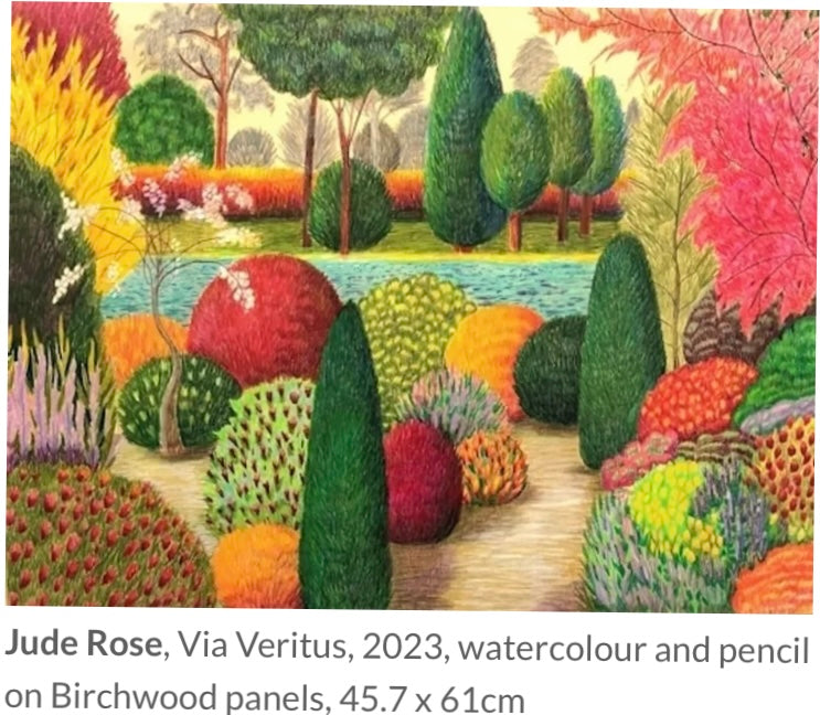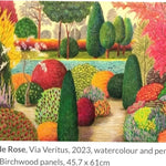 It has been a period of deep reflection and for this I am so grateful. The painting 'Silver Lining' is aptly named as it is symbolic of the great side of being in solitude - a mass production of work that otherwise would not have come to be. I breathe in the fragrant air up here and that alone is inspiration but on top of that there are endless vast and luxurious gardens full of colour and form to wander through. I feel this was meant to be a sign to pause from my other life of Argentine tango and socialising and concentrate fully on my art. I start with a vision in my mind’s eye then do rough sketches but never anything concrete as I love to 'doodle' and allow the painting to develop by itself. I feel like a medium just recording this event. I generally work with memories of childhood, mixed with the contrast of geometric shapes of man-made objects and houses and the soft forms of trees and shrubs. I paint from dark to light adding texture with thin glazes, and work in oils on canvas, pencil on wood or linocut printmaking. My huge garden has been a refuge in these troubling times and I have been doing more close-up work of the flowers I find, they are so intricate and delightful and never cease to amaze me. I absorb the essence of life and recreate and interpret this in my studio, creating a sort of utopia in which to ramble".