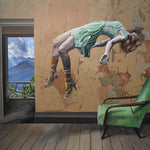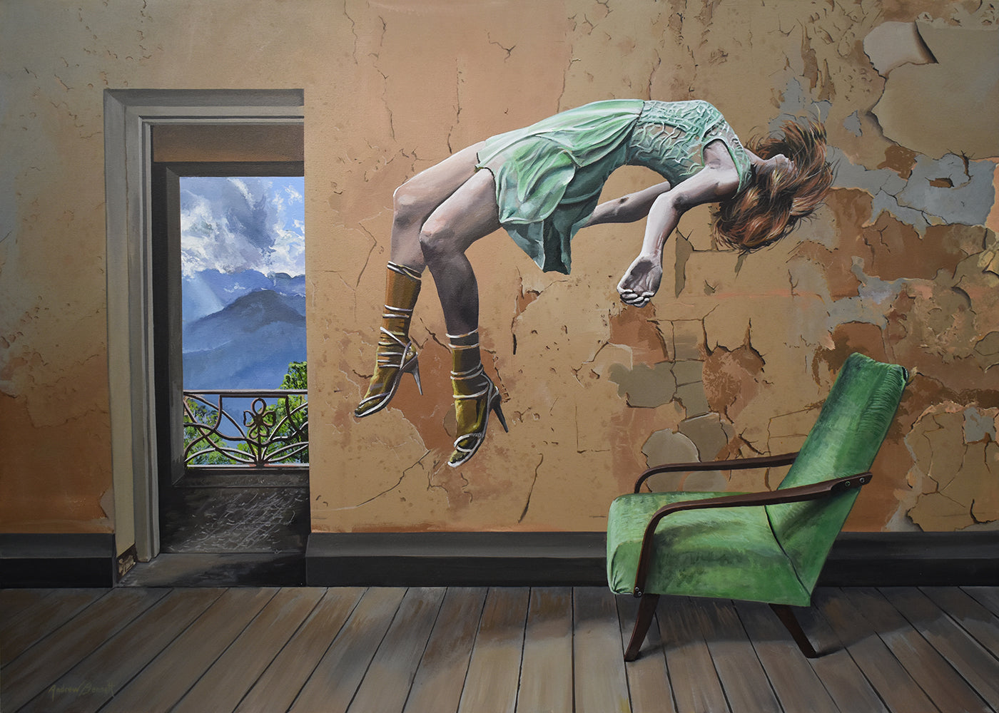 Artist statement: She was on a high from the energy of the disco even after her return to her humble home. A state of celebration and remembered experience. Yet there is a discontinuity between her dressed up attire and her surroundings. What is she escaping from or to?