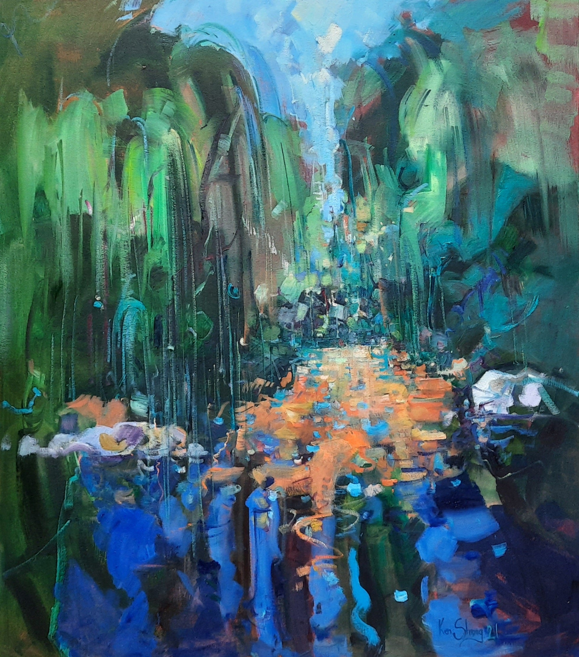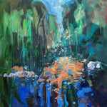 DIrector's Selection: This is one of the most impressive paintings coming out of Ken's studio in the last 2 years. It is beautifully balanced, drawing the viewer to the back of the composition between the two avenues of willow trees on the river banks. On one hand in provides tranquility an ideal place to observe the river in all its splendour however, on the other hand the energy of colour, shape and form, diving into the water is so beautifully contrasted to the splash of orange ochre, the high lights being the the variation of blue in the foreground.