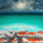 Artist Statement: This painting is drawn from my memories of Wineglass Bay in Tasmania. At first glance, its pristinewaters suggest purity, but they mark a darker history. The rock
