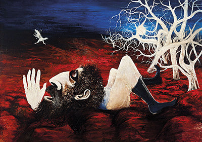 Other paintings in the collection are symbolic explorations of the relationship between the Australian landscape and the European explorers, depicting the pioneers’ wonder and awe at their new harsh and bewildering, yet beautiful, environment. One such piece entitled Explorer Thrown, an oil on canvas, features a lone explorer, prostrate on the red earth of a gloomy Australian outback, desperate and disoriented.