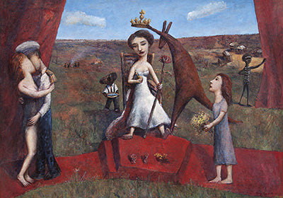 In the mid-1990s, Shead began his Royal Suite series that concentrated on Queen Elizabeth’s tour of Australia in 1954. Mostly satirical in nature, the paintings mock what Shead considered to be Australia’s 19th Century desire to be ruled by a “goddess”, featuring the Queen standing nude on a pedestal or as a mythical being seated on a throne. The pieces also showcase Shead’s talent as a filmmaker featuring wide, panoramic views of Sydney Harbour and a cast of characters from the Australian bushland, welcoming the young ruler to their domain with quiet awe. Looking past the drama, the Royal Suite series is a thoughtful depiction of the relationships that drive the scenes portrayed - the prim, controlled royal couple playing out their public duties are contrasted with a pair of lovers in the shadows, frolicking with freedom and abandon in a comment by Shead on the stifling of inner impulses by social conventions.