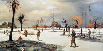 In 1999, Amor was appointed as Official War Artist to East Timor, where he photographed his observations of the everyday life of Australian soldiers and locals and the destruction of the land through which he travelled. Upon his return, Amor painted his impressions of the war-torn country, concentrating on the discomfort experienced not only by Australian soldiers but also by displaced and distressed locals. Completing almost twice the amount of pieces required by the Australian War Memorial, he depicted outdoor troop bathrooms with little privacy, elderly men trudging along carrying their remaining belongings, and blood-stained cathedrals, all in his trademark gradually layered style.