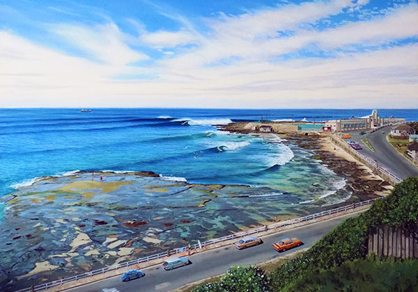 Rod’s love of the local Newcastle to Forster coastline is a constant wealth of material to paint. However his iconic cartoon series often drawn from local identities or Disney like characters contrast with the Australian History themes. Portraiture is another area of significance for him, something not generally known as it is usually commissioned art.